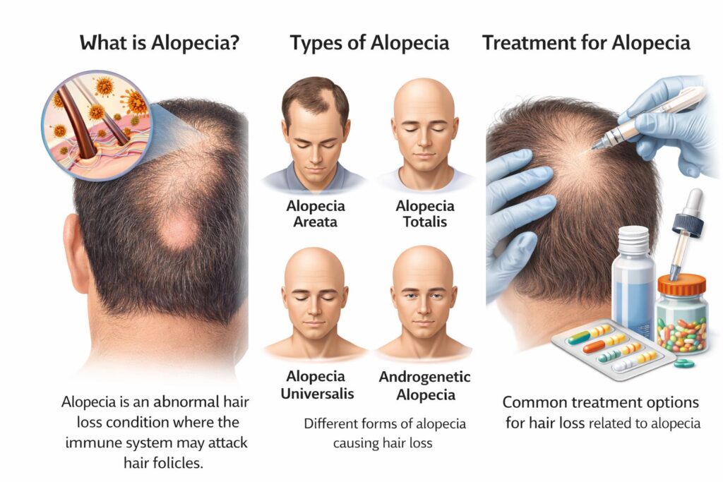 Alopecia is a medical condition characterized by hair loss from the scalp or other parts of the body. While it is normal to shed some hair daily as part of the natural hair growth cycle, excessive or sudden hair loss may be an indication of alopecia. This condition can affect both men and women and can occur at any age. Hair plays a significant role in our personality and self-confidence; consequently, hair loss can sometimes lead to psychological distress or anxiety. Alopecia can stem from various causes, including genetic factors, autoimmune diseases, hormonal fluctuations, and nutritional deficiencies. Understanding the causes, symptoms, and treatment options for alopecia can help individuals effectively manage this condition and maintain healthier hair. What is Alopecia? Alopecia is a medical term used to describe the condition of hair loss. It occurs when hair roots (follicles) become damaged or when the hair growth cycle is disrupted. In some cases, our immune system mistakenly attacks the hair roots, leading to hair loss. Hair growth typically follows a cyclical pattern consisting of three phases: Anagen Phase (Growth Phase) – During this phase, hair grows rapidly from the roots. Catagen Phase (Transition Phase) – In this phase, hair growth slows down, and the hair roots begin to shrink. Telogen Phase (Resting Phase) – During this phase, the hair eventually sheds, and new hair begins to grow in its place. When this cycle is disrupted, hair begins to shed at a rate significantly faster than it grows; this condition is known as alopecia. Causes of Alopecia Alopecia can occur due to a variety of different causes. Some of the most common causes include: Autoimmune Disorders – An autoimmune reaction is a primary cause of alopecia, particularly alopecia areata. In this condition, the immune system mistakenly attacks the hair roots (follicles), leading to hair loss. Genetic Factors – Family history plays a significant role in certain types of alopecia. Individuals with a family history of hair loss may be at a higher risk of developing a similar condition themselves. Hormonal Changes – Hormonal imbalances can also lead to hair loss. Conditions such as thyroid disorders, pregnancy, menopause, or the use of hormonal medications can disrupt the hair growth cycle. Stress – Physical or emotional stress can trigger hair loss. Stress-induced hair loss is often temporary; however, when a significant amount of hair is shed over a short period, it becomes clearly visible. Nutritional Deficiencies – Hair roots require essential nutrients – such as iron, protein, zinc, and vitamins – to remain healthy. If the diet lacks these nutrients, the hair roots may weaken, potentially leading to alopecia. Medical Conditions – Certain illnesses – such as scalp infections, autoimmune diseases, or chronic conditions – can cause hair loss. Medications – Hair loss can also occur as a side effect of certain medications used to treat conditions such as cancer, arthritis, depression, and high blood pressure. Types of Alopecia Alopecia manifests in several different forms, each with its own distinct characteristics. Alopecia Areata This is one of the most common forms of alopecia. It causes sudden hair loss in small, circular patches on the scalp or other parts of the body. Alopecia Totalis Alopecia totalis results in the complete loss of all hair on the scalp. It is considered a more severe form of alopecia areata. Alopecia Universalis This is a rare condition characterized by the loss of hair over the entire body, including the eyebrows, eyelashes, and other body hair. Androgenetic Alopecia Also known as ‘male-pattern baldness’ or ‘female-pattern hair loss,’ this type of alopecia is caused by genetic and hormonal factors. It is the most common form of hair loss worldwide. Traction Alopecia This type of alopecia is caused by repetitive pulling on the hair; this often results from tight hairstyles such as braids, ponytails, or hair extensions. Symptoms of Alopecia The symptoms of alopecia can vary depending on the type and severity of the condition. Some common symptoms include:• Sudden hair loss• Round or patchy bald spots on the scalp• Gradual thinning of hair on the top of the head• Loss of hair from the eyebrows, eyelashes, or beard• Hair falling out in clumps while combing or washing• Changes in hair texture In some cases, hair may regrow on its own, but this process can take several months. Diagnosis of Alopecia Doctors typically diagnose alopecia based on a physical examination and medical history. In some cases, additional tests may be required, such as:• An examination of the scalp to inspect the hair roots (follicles)• Blood tests to detect nutrient deficiencies or hormonal imbalances• A scalp biopsy to examine the condition of the hair roots under a microscope These tests help identify the underlying cause of hair loss. Treatment Options for Alopecia The treatment for alopecia depends on its specific type and severity. Some common treatment methods include: Medications Doctors may prescribe medications to stimulate hair growth or to reduce inflammation within the hair roots (follicles). Topical Treatments Certain specialized solutions or creams, when applied directly to the scalp, can help promote hair regrowth. Nutritional Supplements Supplements containing vitamins, minerals, and proteins can help improve hair health, particularly when hair loss is caused by nutritional deficiencies. Stress Management Reducing stress through relaxation techniques, meditation, or exercise can improve overall health and may also help alleviate stress-related hair loss. Hair Transplantation In severe cases of permanent hair loss, surgical procedures such as hair transplantation may be considered. Prevention Tips for Healthy Hair Although some forms of alopecia cannot be prevented, certain lifestyle habits can help reduce the risk of hair loss.• Maintain a balanced and n