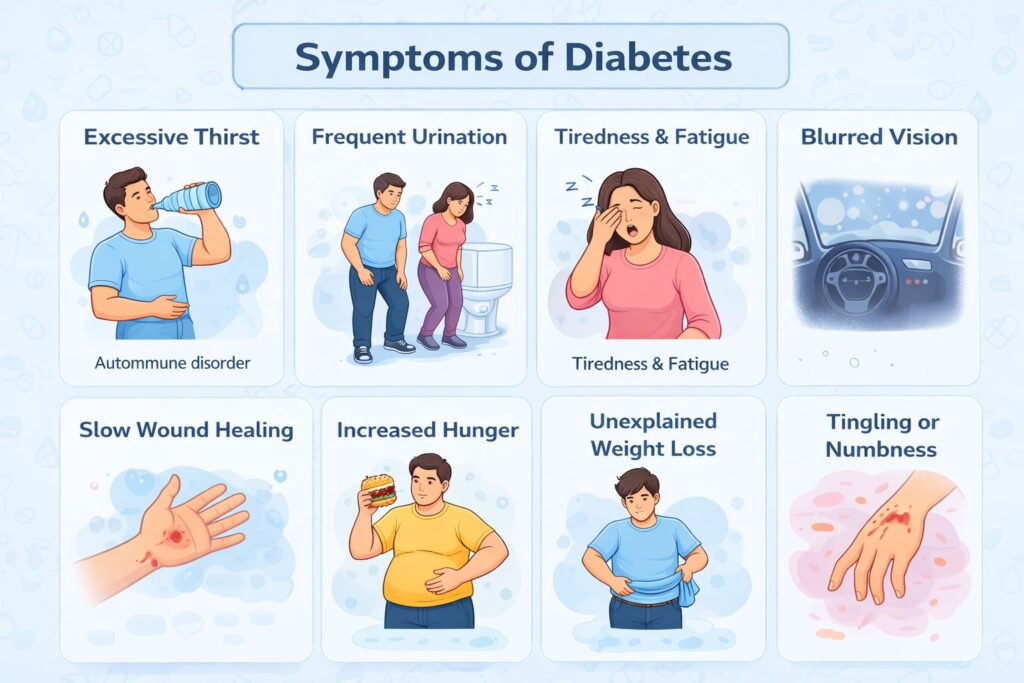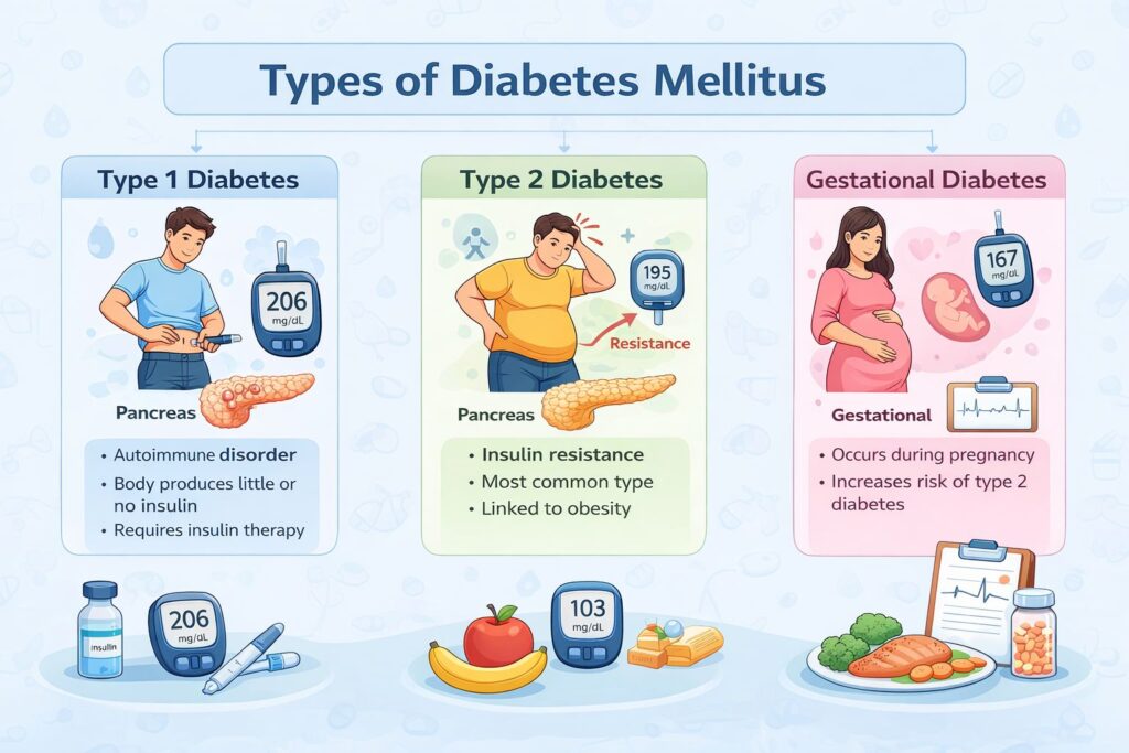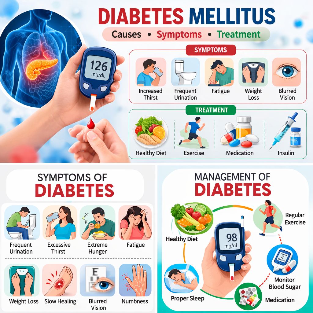Introduction Diabetes mellitus is a chronic metabolic disease characterized by elevated blood glucose levels (hyperglycemia) resulting from a dysfunction in either the production or the action of insulin or both. Insulin is a hormone produced by the pancreas; it facilitates the transport of glucose into the body’s cells, where it is utilized as a source of energy. When the body fails to produce sufficient insulin or is unable to utilize it effectively, glucose begins to accumulate in the bloodstream, leading to diabetes. Diabetes is one of the most prevalent lifestyle related diseases globally, affecting millions of people each year. If left untreated, it can cause severe damage to the heart, kidneys, nerves, eyes, and blood vessels. However, through appropriate lifestyle modifications, medication, and regular medical check-ups, individuals with diabetes can lead healthy and fulfilling lives. What is Diabetes Mellitus? Diabetes mellitus is a condition in which the body is unable to regulate blood sugar levels properly. Normally, after eating food, carbohydrates are broken down into glucose which enters the bloodstream. The pancreas releases insulin to help glucose enter cells for energy production. In diabetes, this process becomes impaired due to either insufficient insulin production or reduced sensitivity to insulin. As a result, blood glucose levels remain elevated, leading to long-term health complications. Types of Diabetes Mellitus Diabetes mellitus is primarily classified into three major types: 1. Type 1 Diabetes Type 1 diabetes is an autoimmune disorder in which the immune system attacks the insulin-producing beta cells of the pancreas. As a result, the body produces very little or no insulin at all. This type typically develops in children or young adults, although it can occur at any age. Patients with Type 1 diabetes require lifelong insulin therapy. Common symptoms include:• Sudden onset of symptoms• Frequent urination• Excessive thirst• Unexplained weight loss 2. Type 2 Diabetes Type 2 diabetes is the most common form of diabetes, accounting for approximately 90–95% of all cases. In this condition, the body becomes resistant to insulin, or the pancreas does not produce sufficient insulin. It is strongly linked to obesity, a sedentary lifestyle, an unhealthy diet, and genetic factors. Risk factors include:• Being overweight or obese• Physical inactivity• A family history of diabetes• Age over 40 years Type 2 diabetes can often be managed through lifestyle changes, oral medications, and, in some cases, insulin therapy. 3. Gestational Diabetes Gestational diabetes occurs during pregnancy and typically resolves after the baby is born. However, women who have had gestational diabetes are at a higher risk of developing Type 2 diabetes later in life. If this condition is not properly managed, it can increase the risk of complications for both the mother and the baby. Symptoms of Diabetes Mellitus Symptoms of diabetes can develop slowly, especially in type 2 diabetes. Some common symptoms include:• Frequent urination• Excessive thirst• Increased hunger• Fatigue and weakness• Blurred vision• Slow healing of wounds• Unexplained weight loss In some cases, individuals may not notice symptoms until the disease becomes advanced. Therefore, regular health checkups and blood sugar tests are important for early detection. Diagnosis of Diabetes Various laboratory tests are conducted to diagnose diabetes, measuring glucose levels in the blood. The most commonly used tests are: 1. Fasting Blood Sugar Test This test measures blood glucose levels after fasting for at least 8 hours. Normal Level: Less than 100 mg/dL 2. HbA1c Test This test measures the average blood sugar level over the past 2–3 months.• Normal: Less than 5.7%• Prediabetes: 5.7%–6.4%• Diabetes: 6.5% or higher 3. Oral Glucose Tolerance Test This test measures blood sugar levels before and after consuming a glucose solution to determine how the body processes sugar. Early detection of diabetes is crucial to prevent long-term complications. Treatment and Management of Diabetes Although diabetes cannot always be completely cured, it can be effectively managed through proper medical treatment and lifestyle modifications. 1. Healthy Diet A balanced diet plays a crucial role in controlling blood sugar levels. Recommended dietary habits include:• Consuming whole grains• Increasing fiber intake• Reducing the consumption of sugar and processed foods• Controlling carbohydrate intake 2. Regular Physical Activity Exercise improves insulin sensitivity and helps maintain a healthy body weight. Activities such as walking, cycling, and swimming can be highly beneficial in managing diabetes. 3. Medications Doctors may prescribe medications based on the specific type of diabetes. Common treatment methods include:• Oral diabetes medications• Insulin injections• Combination therapy 4. Blood Sugar Monitoring Regular monitoring of blood glucose levels enables patients to maintain better control over their condition and helps prevent potential complications. Complications of Diabetes If diabetes is not properly managed, it can lead to serious complications such as:• Heart disease• Kidney damage (diabetic nephropathy)• Nerve damage (diabetic neuropathy)• Vision problems or blindness• Foot ulcers Proper management and regular medical checkups can reduce the risk of these complications. Prevention of Diabetes Certain lifestyle modifications can help reduce the risk of developing type 2 diabetes:• Maintain healthy body weight• Follow a balanced diet• Exercise regularly• Avoid smoking and excessive alcohol• Get regular health checkups Adopting these habits can significantly lower the risk of developing diabetes. Conclusion Diabetes mellitus is a widespread metabolic disorder that requires continuous monitoring and management. Understanding its causes, symptoms, and treatment optio
